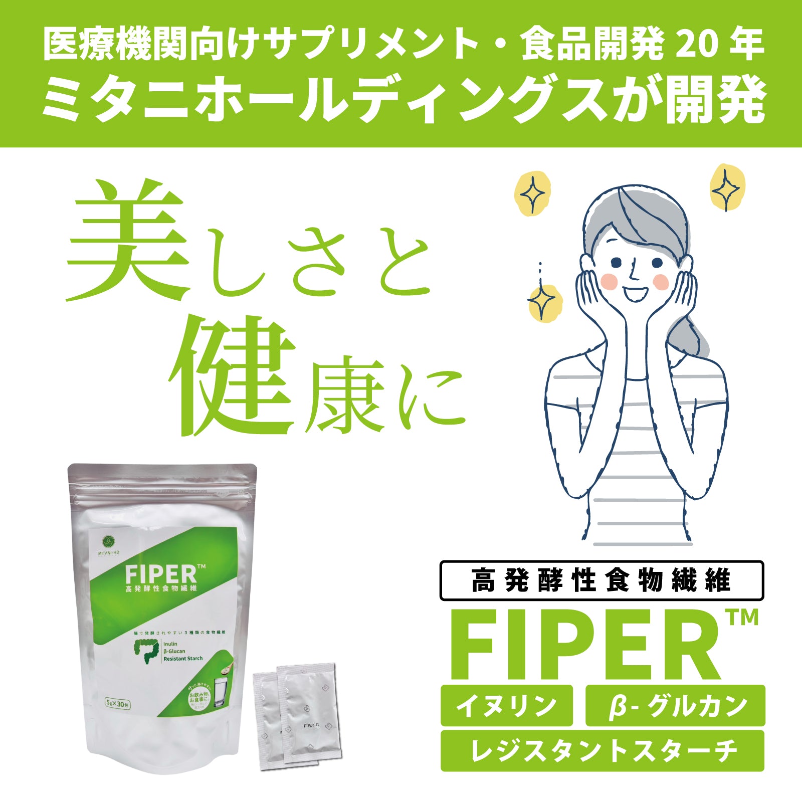 FIPER™はミタニHD独自の研究開発により、イヌリン、β-グルカン、レジスタントスターチという3種類の高発酵性食物繊維を摂ることで、腸の入口・中央・最奥部のそれぞれ3か所で腸内細菌による持続的な発酵が起こる仕組みを実現。